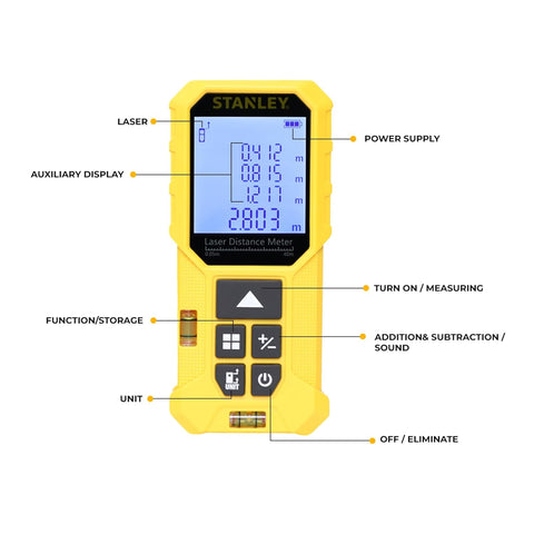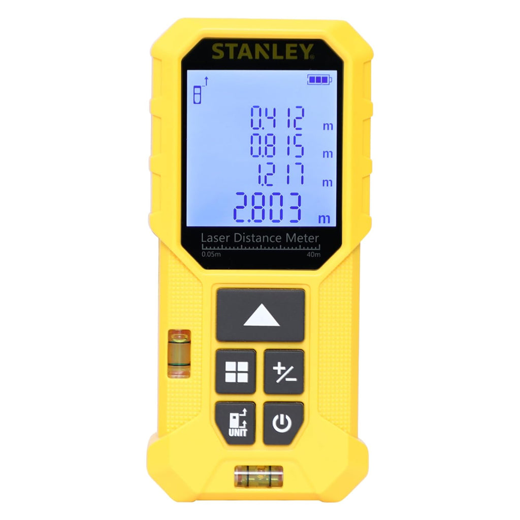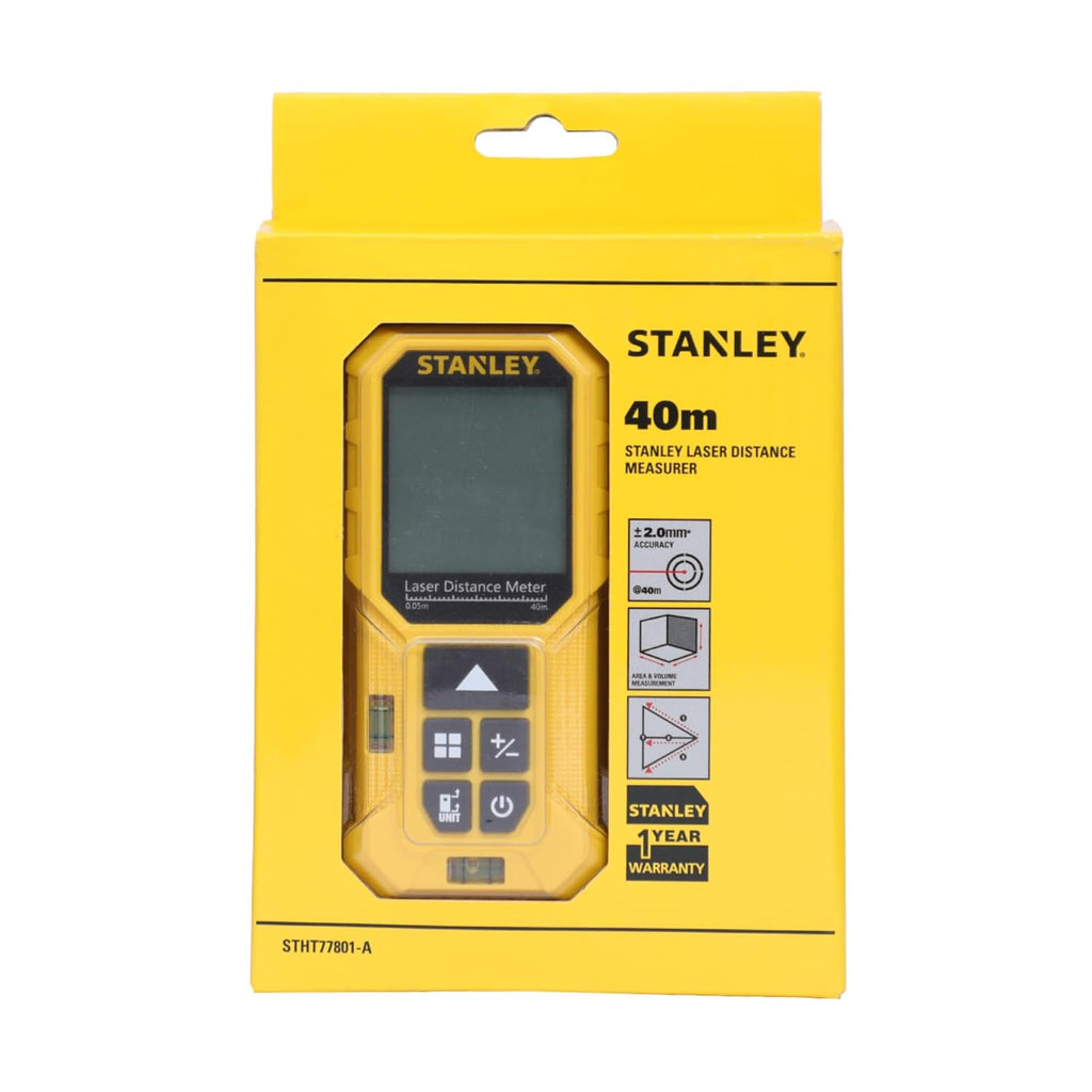 - STANLEY STHT77801-A Cordless Laser Distance Meter - 40 M. INCLUDES: 1 Laser distance meter, 2 Batteries, 1 Carry Pouch, User Manual, Warranty card