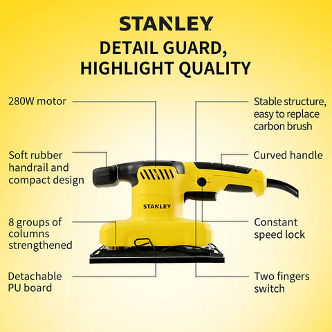 The Stanley SS28 Sheet Sander is a powerful and efficient tool designed for smooth and fast material removal in sanding applications. Featuring a 280W motor, this sander provides high speed (up to 14,000 RPM) with low vibration for optimal sanding results. Its aluminium base measures 90 x 185 mm, suitable for 1/3 sheet sanding. The compact design, rubberized handles, and front grip ensure operator comfort and better control during use. The sander includes a dust collection system, a lock button for continuous operation, and a speed control selector for adjustable sanding performance. Built for durability, it offers longer brush life and enhanced longevity, making it ideal for both professional and Diy projects.