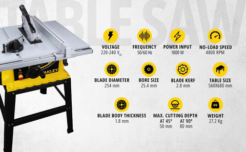 The Stanley SST1801 1800W 254mm Table Saw is a powerful and versatile saw that is perfect for a variety of applications. With a powerful 1800W motor, it can handle even the most challenging cuts with ease. The Stanley Table Saw is the perfect addition to your woodworking shop. This saw is powerful, with a 1800 watt motor, and is designed for accuracy and precision. The heavy-duty 27 kg construction ensures that this saw will withstand years of use. This table saw is perfect combination power, accuracy and durability.