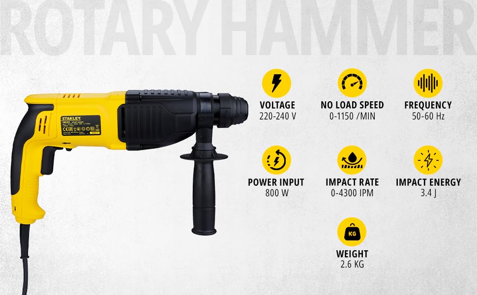 Stanley SHR263K Sds Plus Hammer, that is suitable for heavy duty and the best choice to use in concrete. In concrete, the drilling capacity of this hammer drill is 26mm. You can use this in 3 Modes and has the power input of 800w. This hammer drill can fix the holes in concrete and masonry. It is available with good chipping capabilities and best for light chipping applications. Its high power motor is an ideal choice for drilling anchor.