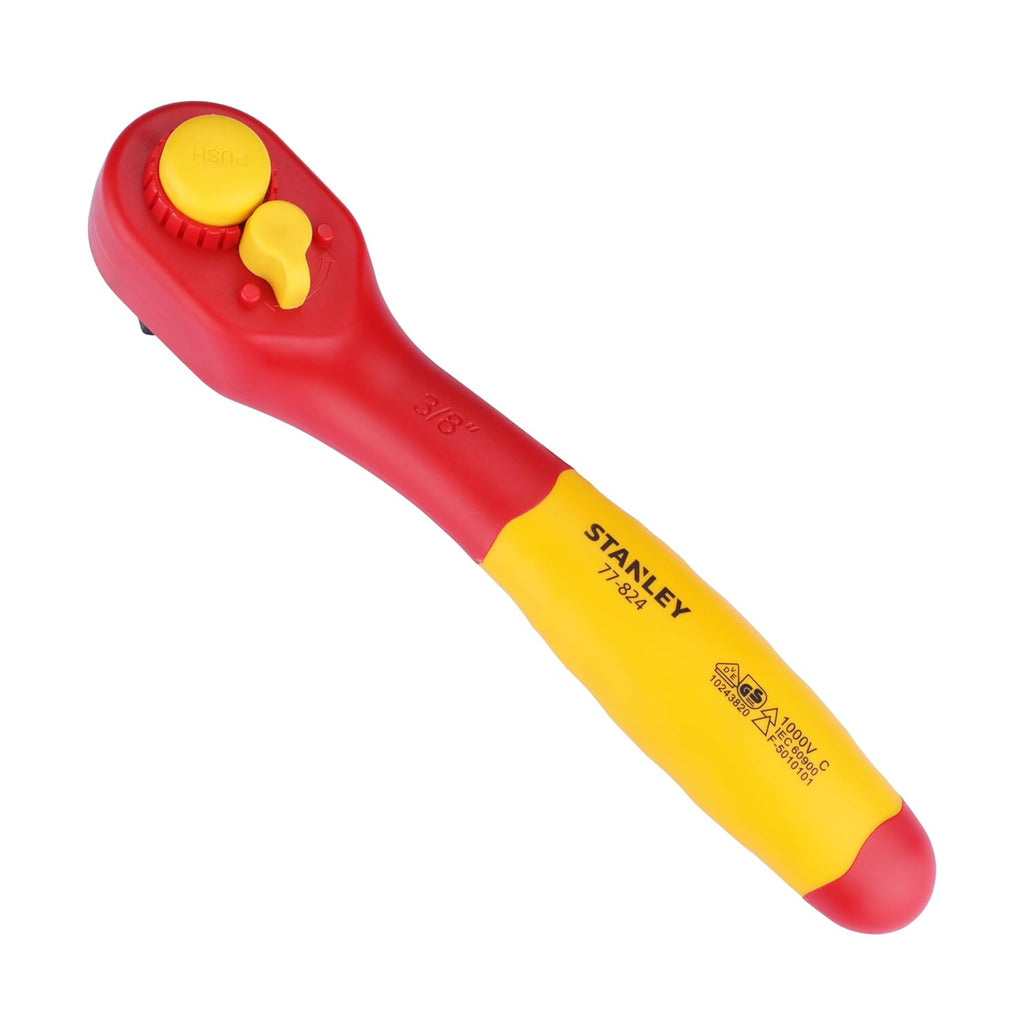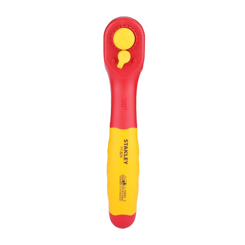The Stanley 3/8" VDE Insulated Ratchet is a must-have tool for professionals seeking safety and precision in electrical and mechanical tasks. Engineered with high-quality insulation, this ratchet provides protection against electric shocks, making it ideal for work on live circuits and sensitive equipment. The hexagonal ratchet head ensures a secure grip on fasteners, allowing efficient tightening and loosening in confined spaces.