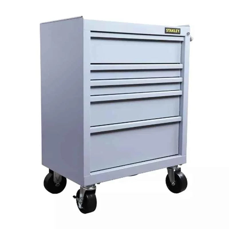 The STANLEY STST74420-8 5-Drawer Eco Roller Cabinet in Grey is a durable and versatile storage solution designed to meet the needs of professionals and DIY enthusiasts. With its sturdy construction and ample storage capacity, this roller cabinet offers convenient organization and easy access to tools and equipment in workshops, garages, and other workspaces. With its vibrant Grey colour, the STANLEY STST74420-8 roller cabinet adds a touch of style to any workspace while ensuring high visibility. Crafted from sturdy steel, the cabinet is built to withstand heavy-duty use in demanding work environments, ensuring long-lasting performance. Featuring five spacious drawers of varying sizes, the roller cabinet provides ample storage space for tools, parts, and accessories of different shapes and sizes. Equipped with smooth-gliding ball-bearing slides, the drawers allow for effortless opening and closing, even when fully loaded. Designed with convenience and versatility in mind, the STANLEY STST74420-8 roller cabinet comes with a lockable design to secure tools and keep them organized. Additionally, the top surface can serve as a workbench or extra storage space for frequently used tools or equipment. Equipped with four sturdy caster wheels, including two swivel casters with brakes and two fixed casters, the roller cabinet can be easily maneuvered around the workshop for maximum flexibility and convenience. The durable wheels ensure smooth and stable movement, even when transporting heavy loads. Overall, the STANLEY STST74420-8 5-Drawer Eco Roller Cabinet in Grey offers a reliable and efficient storage solution for professionals and DIY enthusiasts. Its durable construction, ample storage capacity, and convenient features make it an essential addition to any workshop or garage, providing convenient organization and easy access to tools and equipment whenever needed.